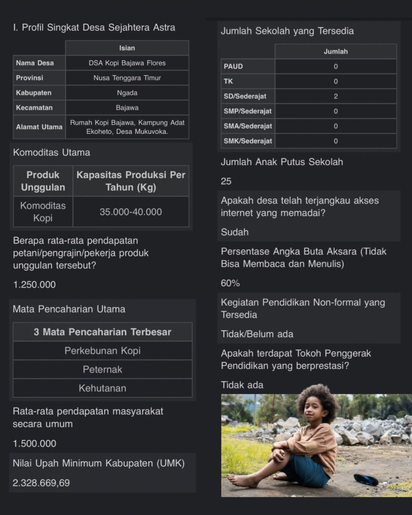 Menelusuri apa yang telah terjadi, pada pekan lalu kami akhirnya melakukan identifikasi langsung di dua desa mayoritas aktivitas pemberdayaan sosial-ekonomi bersama PT Astra International Tbk melalui program Desa Sejahtera Astra; Desa Mukuvoka dan Desa Wawowae, Kecamatan Bajawa, Kabupaten Ngada, Nusa Tenggara Timur. Apa yang kami temukan sangat menggetarkan hati, hanya ada 1 Sekolah Dasar di masing-masing desa! Tak ada PAUD, TK, SMP, SMK, atau sederajat, bahkan belum ada kegiatan non-formal yang tersedia. Berdasarkan tren data disertai hasil pemetaan tersebut, kami merekomendasikan untuk dilakukannya ekspansi melalui perubahan skema pengadaan sosial-ekonomi dengan penambahkan input pilar pendidikan.