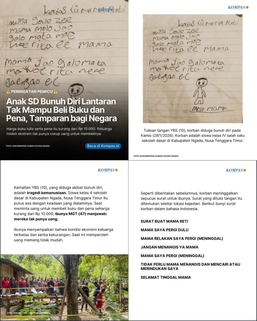 Pekan ini kita dihebohkan dengan peristiwa bunuh diri YBS (10th), siswa kelas IV salah satu Sekolah Dasar di Kabupaten Ngada, Nusa Tenggara Timur. Aksi bunuh diri dilatarbelakangi ketidak-mampu-an keluarga membeli buku dan pena senilai 10.000, ibu YBS menerangkan bahwa kondisi ekonomi keluarga terbatas dan serba kekurangan, saat ini memperoleh uang memang tidak mudah. Bagi sebagian besar kalangan, nominal di atas merupakan angka yang kecil dan cukup mudah untuk diperoleh; “ga perlu sampai mengorbankan masa depan anak-lah, apalagi bunuh diri”., tetapi bagi sebagian kecil keluarga terbelakang di daerah tertinggal, angka 10.000 bukan angka biasa, dapat dipakai membeli lauk selama 3-4 hari, perlu kerja keras memperolehnya. Isu biaya pendidikan ini selaras dengan keadaan ekonomi dan sosial masyarakat, jika tak dimitigasi dalam rencana pembangunan daerah yang baik maka akan berdampak serius bagi generasi penerus di masa depan.